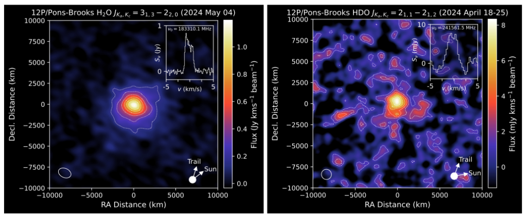 Gracias a la sensibilidad excepcional y a las capacidades únicas de ALMA, un equipo internacional liderado por Martin Cordiner, del Goddard Space Flight Center de la NASA, logró mapear por primera vez la distribución de agua común (H₂O) y agua pesada (HDO, que contiene deuterio) en la coma, la nube de gas que rodea el núcleo, de un cometa. Estas observaciones, realizadas durante el acercamiento del 12P/Pons-Brooks al Sol, se combinaron con mediciones infrarrojas del Infrared Telescope Facility (IRTF) de la NASA para determinar con precisión inédita en un cometa de este tipo la proporción de deuterio a hidrógeno (D/H).