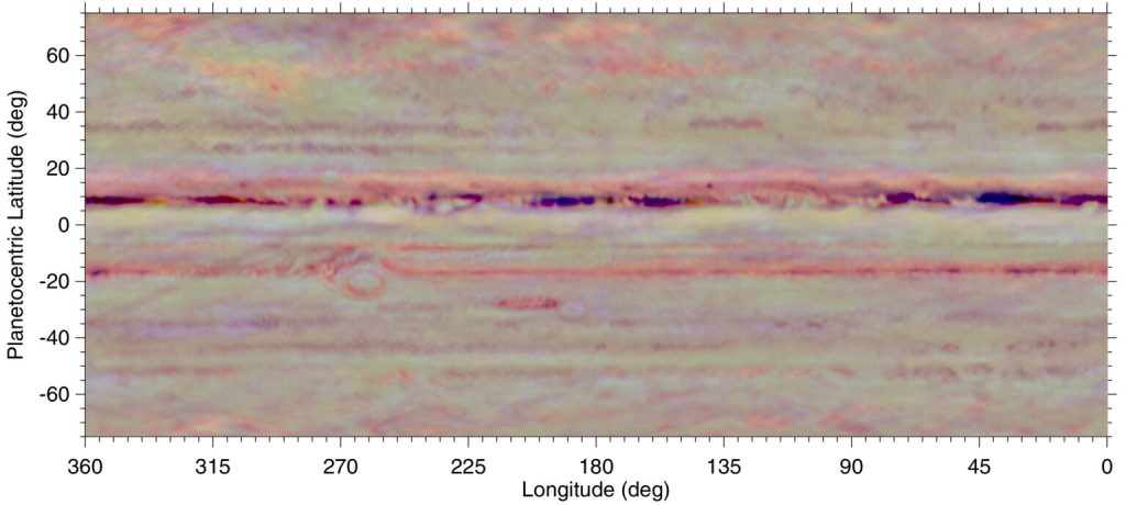 «Juno realmente muestra que el amoniaco se agota en todas las latitudes hasta unos 150 kilómetros, lo cual es realmente extraño», dijo de Pater, quien descubrió hace 10 años que el amoniaco se agotaba hasta unos 50 km. «Eso es lo que Chris intenta explicar con sus sistemas de tormentas que se extienden a mucha más profundidad de lo que esperábamos».