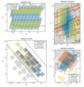 «La idea es obtener el conjunto de datos multilongitud de onda definitivo para la astronomía extragaláctica», declaró Marchesini en un comunicado de prensa. MINERVA se centrará en cuatro campos extragalácticos ya observados por el JWST: UDS, COSMOS, AEGIS y GOODS-N. Utilizará un total de aproximadamente 387 horas de observación, algunas de ellas simultáneas, para realizar su estudio. El tiempo de observación del JWST tiene una gran demanda, lo que explica la escasez de este tipo de conjuntos de datos.