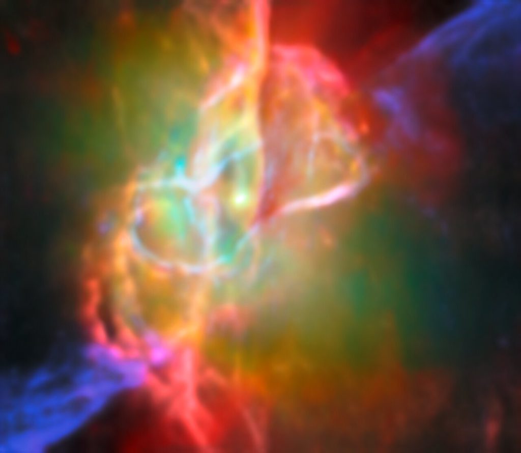 La compleja estructura en el centro de la Nebulosa Mariposa, NGC 6302. En el centro se encuentra una fuente brillante rodeada de una nebulosidad verdosa y varias líneas onduladas de color crema, naranja y rosa. Una de estas líneas parece formar un anillo vertical, casi de canto, alrededor de la fuente brillante central. Otras líneas trazan un ocho. Partiendo de estas complejas líneas y de la nebulosidad verde, se extiende una sección de luz roja a ambos lados del objeto. Las esquinas superior derecha e inferior izquierda de esta imagen muestran una franja púrpura que sobresale de la imagen.