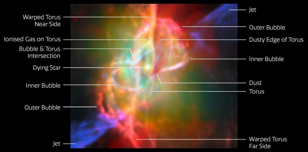 La compleja estructura en el centro de la Nebulosa Mariposa, NGC 6302. En el centro de la imagen se encuentra una fuente brillante, denominada «estrella moribunda». Esta está rodeada de una nebulosidad verdosa y varias líneas onduladas de color crema, naranja y rosa. Una de estas líneas parece formar un anillo vertical, casi de canto, alrededor de la fuente brillante central. Este anillo está marcado en varios puntos para indicar los lados cercano y lejano de una estructura llamada toro, una franja de polvo que recorre el toro y una zona donde este se ioniza. Otras líneas trazan una figura en forma de ocho. Estas líneas indican la burbuja interna, así como su intersección con el toro. Partiendo de estas complejas líneas y la nebulosidad verde, se observa una sección de luz roja a ambos lados del objeto, denominada «burbuja externa». Las esquinas superior derecha e inferior izquierda de la imagen muestran una franja morada que sobresale. Estas franjas moradas se denominan «chorro».